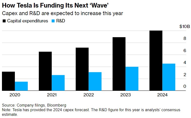 特斯拉已表示将为下一代电动汽车和其他增长计划投入大量资金,今年的资本支出预算将超100亿美元。分析师还预计,该公司的研发支出将增至约45亿美元。