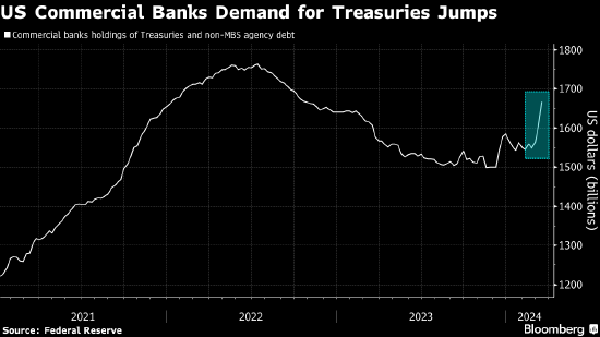 RBC Capital Markets的美国利率测率主管Blake Gwinn表示,“由于存款余额仍然很高,贷款增长缓慢,加之美联储接近进入降息周期,银行业增持收益率较高的美国国债是合理做法”。但是鉴于两周来的强力买入情况,RBC分析师认为“可能还有其他外因影响到这些数据,至于具体是什么,还没完全弄清楚”。