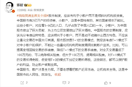 #我给吴清主席支个招#股市制度,应该有利于小散户而不是倾斜向机构投资者。中国股市有2亿开户的投资者,小散户,这是中国特有的,其它国家根本不能比。这些小散户,对应着5-6亿的人口,几乎占到了中国人口的一半。小散户,为中国股市做出了巨大贡献,为上市公司发展做出了巨大牺牲。中国股市的交易制度,应该充分考虑这种特色,应该倾向于小散户,而不是动不动搞什么西方特色,不应该让量化交易在中国大行其道。股市既然是T+1的交易模式,就应该考虑T+1模式下对中小散户的保护,不能让一些量化机构利用制度漏洞收割散户韭菜。比如,可以提高变相回转交易的手续费,降低T+1模式下的交易手续费。对全天交易量低于100万元的,可以免除相关税费,但大于100万元,提高相关税费。对T+1模式下的交易所得免税,但变相T+0的模式下加征交易所得税。这些做法,都可以保护散户的利益,防止散户被割韭菜。