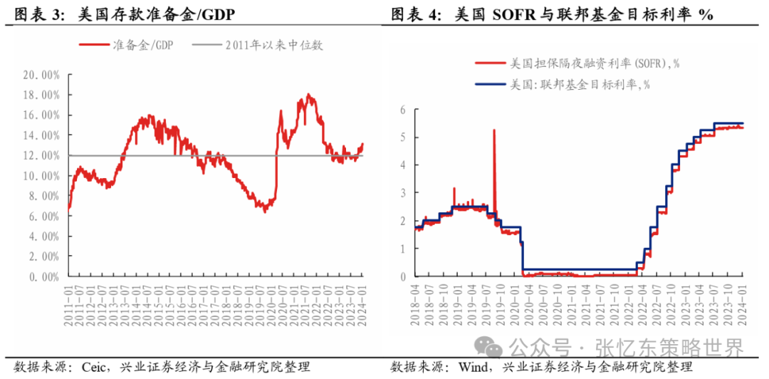 1)假设逆回购按照2023年8月以来的速度继续消耗,预计在4月底5月初即将回到疫情前的水平。届时,联储继续缩表将冲击银行准备金。截至2024年1月14日,银行准备金占GDP的比例为12.7%,而2011年以来这一比例的中位数水平为11.9%。
