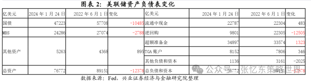 2022年6月以来联储缩表效应大部分被逆回购的下降吸收,随着2024年逆回购有望降至正常化,缩表对银行准备金的冲击将加大。2020-2021年美国实施超级快速的货币财政政策,逆回购市场的规模猛增,形成“蓄水池”作用。2022年6月1日至2024年1月24日,美联储总资产下降了12378亿美元,在联储资产负债表的负债方,逆回购下降了12505亿美元,银行准备金反而增加了1323亿美元。