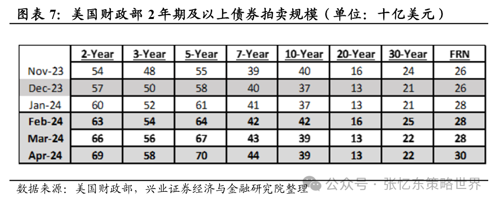 2.2、美国财政部发布的债券拍卖计划也显示了在二季度,美债的供给压力将下降。美国财政部将在 2024 年 2 月至 4 月的季度继续逐步增加2年期及以上债券拍卖规模,根据目前预计的借款需求,美国财政部预计在之后未来几个季度内,不需要进一步增加拍卖规模。