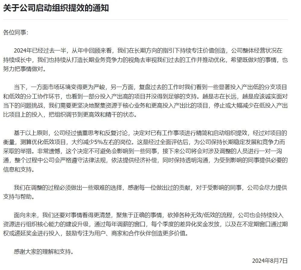 据透露,得物于8月7日下午发布全员信。信中提及,基于长期保持业务竞争力考虑,在更为复杂的市场环境下,“需要更坚决地聚集资源于核心业务和更高投入产出比的项目,停止或大幅减少在低投入产出比项目上的投入,把组织调节到更高效和精干的状态”。信中也明确表示,“大约减少5%左右的岗位。”